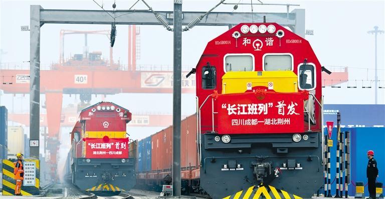 On December 10 at 10 a.m., the inaugural rail-water intermodal “Yangtze River Express” freight train loaded with goods embarked on its journey from the Chengxiang Railway Station in Chengdu. This express will reach Jingzhou, Hubei by railway and further distribute goods to destinations in Jiangsu, Shanghai, and beyond via the Yangtze River. The implementation of this service is expected to reduce transportation time from the previous 15-20 days to approximately 10 days, resulting in a substantial enhancement of cargo transport efficiency. Photo by Hu Zhiqiang (View of China Economic Daily)