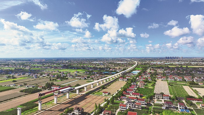 On July 22, at the Qidong Grand Bridge beam erection site in Qidong city, Jiangsu province, the last 40-meter box girder was precisely lifted and placed onto the bridge pier by a girder launcher, completing the installation of all 40-meter box girders on the Shanghai-Nanjing section of the Shanghai-Nanjing-Hefei High Speed Railway.