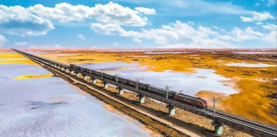 A train passes over Taitema Lake, located north of Ruoqiang county.