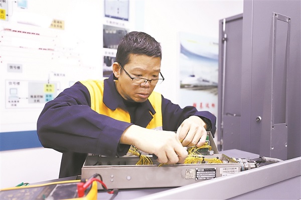 此后3个月,他每天下班后多留一小时,绘制电路原理图,推演电路逻辑,常为设定一个参数熬至深夜。为了确定最佳电源电压,他连续一周开展测试,数据记满3个笔记本。没有专用工具,他就用锉刀、烙铁手工制作;信号传输不稳定,就一次次调整电路布局。经过反复改进,他成功搭建起车载设备室内检修试验平台。车间副主任付瑜忠评价说:“有了这个平台,不用上车就能完成TAX等设备检修和模拟试验,大幅提升了检修效率。”