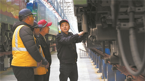 援藏干部杨志勇(右一)在格尔木机务段拉萨机辆整备中心给青年职工讲解专业知识。王喜栋 摄