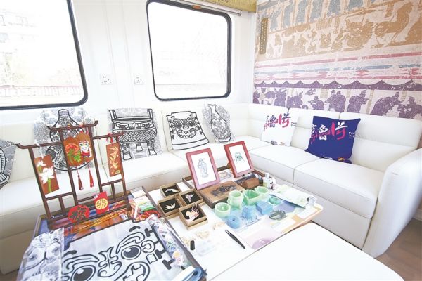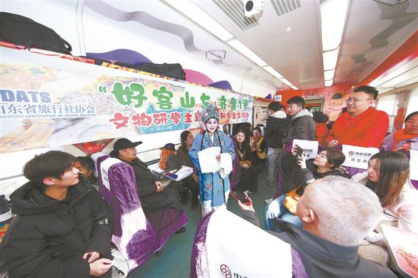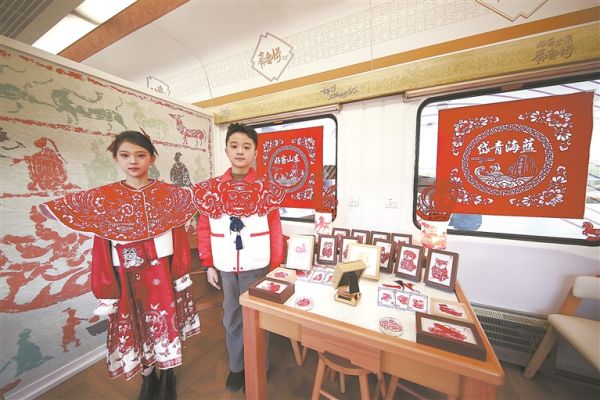 “好客山东·齐鲁1号”文物研学主题旅游列车热闹非凡:山东歌舞剧院演员献唱《上春山》;青铜主题车厢以图片形式展示各种青铜时代的文物;参与研学的小旅客展示体验非遗剪纸作品;各种文物艺术品集中亮相。