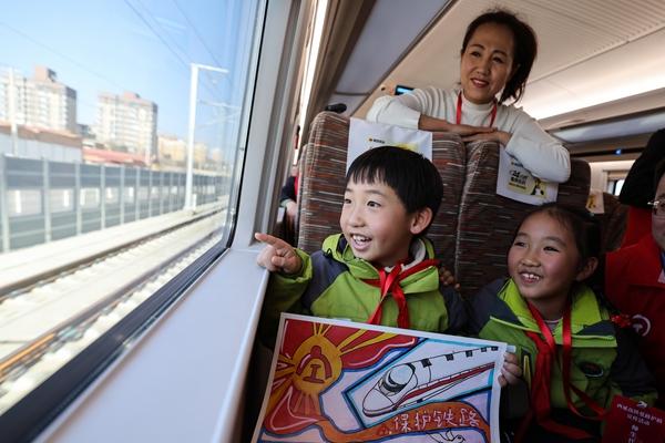 12月7日,师生代表在延安站开往西安北站的复兴号动车组列车上观赏沿途风景。当日,来自西安、延安、铜川、渭南四市的西延高铁沿线居民及中小...