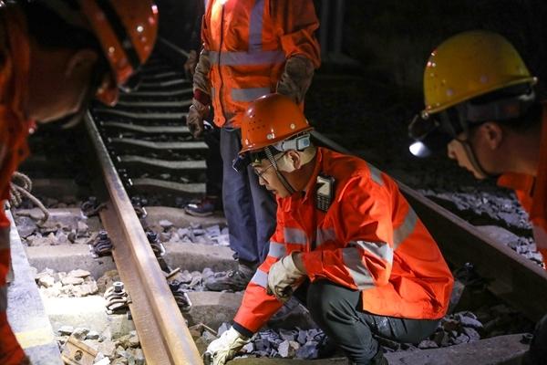 春运期间,在中国铁路南昌局集团有限公司厦门工务段泉州线路车间泉州综合维修工区,工长田兴旺带领着工友们坚守岗位,保障杭深铁路运行畅通无阻。图为田兴旺在泉州...
