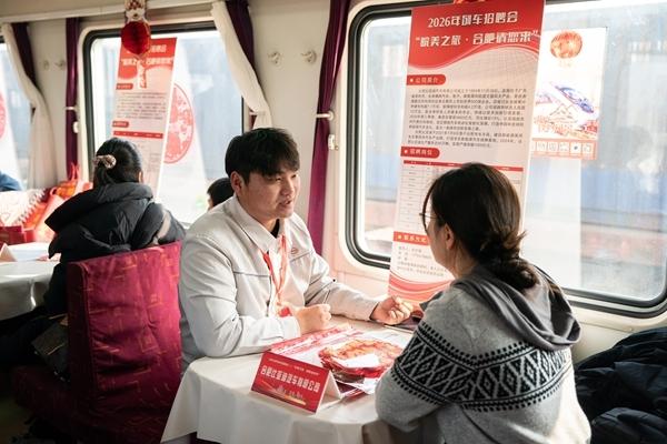 2月5日,招聘企业代表在K8362次列车上向旅客介绍企业信息。当日,由中国铁路上海局集团有限公司合肥客运段联合合肥市人力资源和社会保障局举办的列车招聘会在上海...