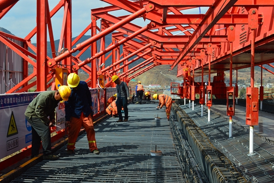 随着周家村特大桥首榀移动模架现浇梁桥梁完成浇筑,渝昆高铁的建设开始提速。图为建设者们在周家村特大桥上进行钢筋绑扎作业。