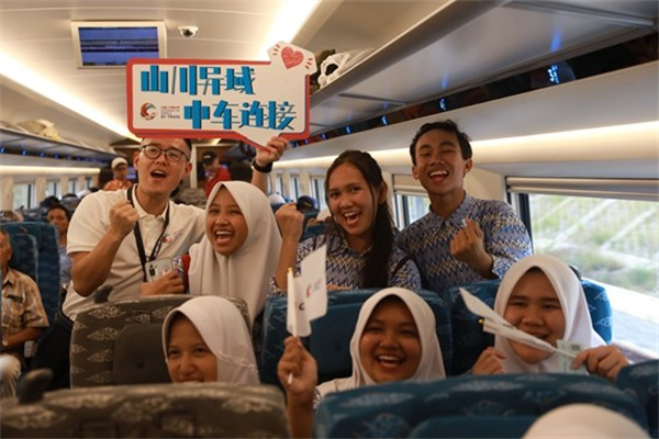 2023年10月24日,印尼万隆岸普拉第三国立初级中学的50多名学生搭乘雅万高铁,从万隆前往雅加达。这是他们首次体验高铁之旅。图为学生们在飞驰的列车上欢呼。