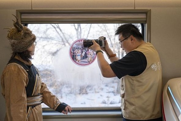 1月25日,摄影师在Y783次“悠享龙江·银旅号”列车上为旅客拍照。当日,在黑龙江省哈尔滨开往亚布力方向的Y783次“悠享龙江·银旅号”旅游列车上,旅客们换上各式服装,体验免费旅拍服务。这是中国铁路哈尔滨局集团有限公司今年开行的首趟旅拍列车,车体升级,空间更大,为旅客打造移动“照相馆”,提升旅客的旅拍体验。新华社记者 张涛/摄