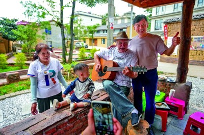 云南曲靖土瓜冲村蝶变幸福旅居村,图为旅居客(右二)在聚会上边弹吉他边唱歌。新华社发