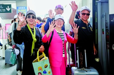 银发游客乘坐高铁从上海火车站出发,开启康养之旅。新华社发