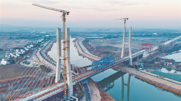 1月8日,新建上海至南京至合肥高速铁路控制性工程——南京特大桥跨滁河斜拉桥顺利合龙。沪宁合高铁建成后,将优化沿长江地区铁路网布局,助力长三角一体化高质量发展。新华社发