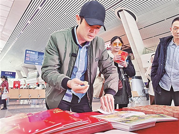2月10日,一场“话百家姓 过中国年”姓氏文化互动活动在厦门站候车大厅举行。图为台湾旅客在定制明信片上拓印姓氏。万宇摄/光明图片