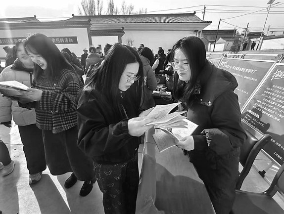 甘肃陇西乡村广场上,务工人员仔细翻阅岗位手册寻找就业机会。邱玥摄/光明图片