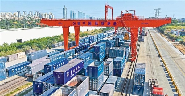 最新数据显示,2025年西部陆海新通道班列发运集装箱货物142.5万标箱,同比增长47.6%,首次实现年发运量突破百万标箱。这是2026年1月8日拍摄的南宁国际铁路港。