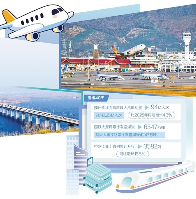 2026年春运近日落下帷幕。交通运输部统计数据显示,春运40天,预计全社会跨区域人员流动量94亿人次,日均2.35亿人次,比2025年同期增长4.3%,再创历史新高。