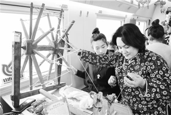 图为旅客体验山东手造汉家老苗手工织布。颜笑摄