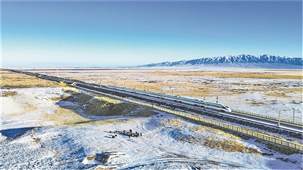 科技日报:一列动车组列车行驶在山丹马军场境内的兰新高铁上