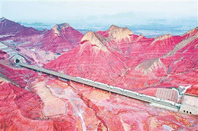 图为1月18日,一列动车组列车行驶在兰州市境内的丹霞地貌群中。