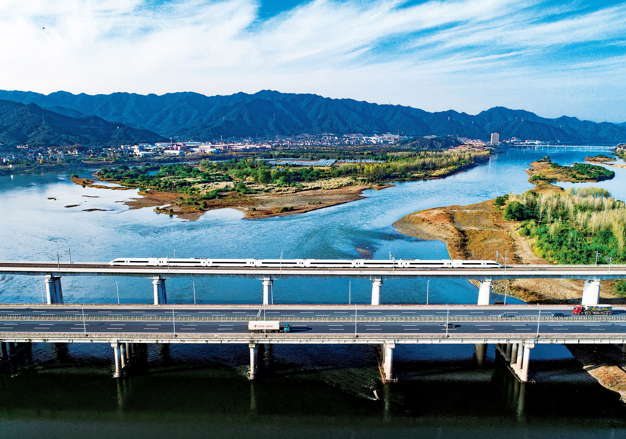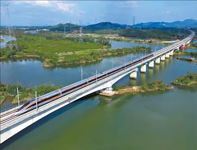 图为22日,从湛江北站开往广州白云站的列车驶过丰头河特大桥。魏 婕摄(新华社发)