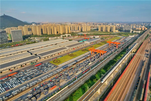 一列满载新能源汽车的列车从赣州国际陆港驶向深圳盐田港。胡江涛摄(人民视觉)