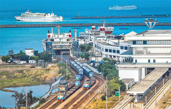 2月6日,一列载有旅客的列车驶入海南海口南港码头,在精准对位后,被分成多段推入海南铁路渡轮船舱,以“火车坐船”的方式跨越琼州海峡。张 茂摄(影像中国)