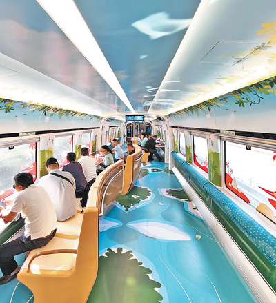 海南三亚至乐东旅游铁路投运“凤舞九天”“天涯海角”“回首之约”三大主题列车,该线路运营的动车组列车面向车窗的座位设计,便于游客一览岛屿美景。3月25日,市民游客乘坐“回首之约”号列车出行。
