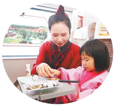 在陕西西安北站开往香港西九龙站的G828次文化主题列车上,汉景帝阳陵博物院工作人员指导小朋友体验文创制作。彭宇锟摄(人民视觉)