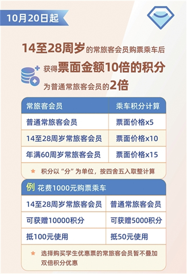 10月20日起,中国国家铁路集团有限公司优化升级“铁路畅行”常旅客会员服务,对14至28周岁持居民身份证、港澳台居民居住证、港澳居民来往内地通行证、台湾居民来往大陆通行证、外国人永久居留身份证的常旅客会员实施更大幅度的积分优惠。会员积分在兑换火车票的基础上,新增座位升席功能,常旅客会员积分的应用场景进一步拓展,旅客将获得更多实惠。