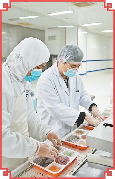 走到餐食包装车间,饭菜的香气扑面而来,两台封膜机将餐盒整齐封装。“在这里封装的1万多份盒饭,每份都要进行人工按压检查。”传送带前,孙轶拿起一份刚下线的盒饭,用手在封膜边缘按压,“要确保封膜严密,没有漏气,印刷信息准确无误。”