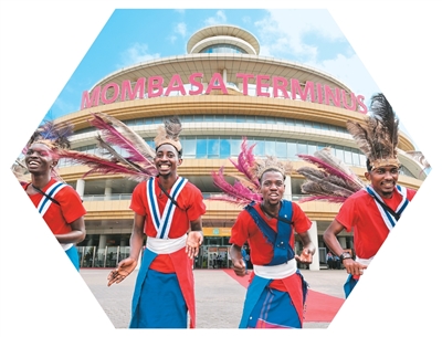 在蒙内铁路蒙巴萨终点站,身穿传统民族服装的演员跳舞庆祝项目完工。