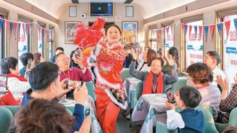 2025年12月28日,游客在黑龙江哈尔滨开往亚布力的旅游列车上观看民俗表演。原 勇摄(人民图片)