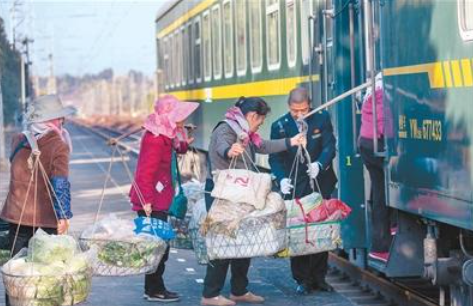 2月13日上午,由云南昆明开往贵州红果的5652次列车驶入吴官田站。这趟由中国铁路昆明局集团有限公司开行的公益慢火车全程5小时38分、停靠15个站点,票价低廉,是沿线百姓的“致富专列”。图为列车客运人员帮助菜农上车。杨俊鹏摄(新华社发)