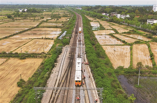 4月20日,在沪昆铁路衙前至进贤区段,南铁南昌工务段线路工在大型养路机械的配合下开展集中修施工。
