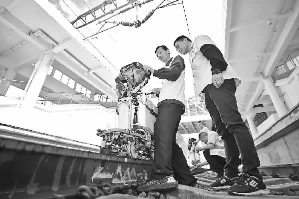 如何准确快速判断钢轨伤损位置,提高工作效率?中国铁路郑州局集团有限公司南阳工务段职工熊建波采用易打磨钻孔且抗蚀性能好的铝合金为原材料,通过公式计算和反复试验,制作研究出“标尺仪”。“标尺仪”长135毫米,安装在钢轨探伤仪37°探头位置,实现在探伤范围内准确标注伤损点。该工具的制作运用提高了钢轨探伤的精准度,将工作效率提高5倍,有效节约人力物力。