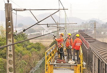 1月7日,在武九铁路瑞昌至白杨畈区段,中国铁路南昌局集团有限公司南昌供电段九江供电车间的接触网工们正在对接触网绝缘子进行冲洗作业,清除附着在绝缘子上的油污,以防出现接触网跳闸或大面积停电故障,确保供电设备性能良好,为2022年春运安全提供有力保障。胡国林 徐佳奇 摄