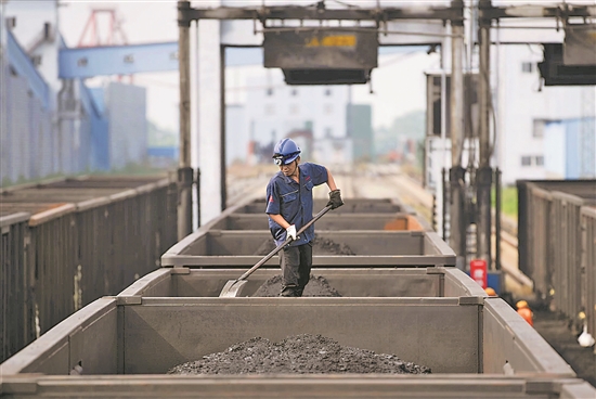 8月25日,在江西省煤炭储备中心的长江码头,工人们正在货物列车上平整电煤。8月以来,江西各地持续高温,用电量持续攀升。中国铁路南昌局集团有限公司九江车务段和水运部门积极开展水铁联运,日夜兼程抢运电煤,保证电厂用煤需要。胡国林 代建力 摄