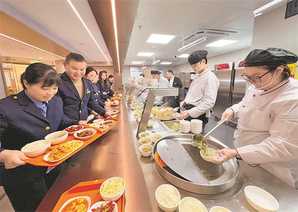 1月13日,职工在“西子餐厅”享用午餐。杭州客运段“西子餐厅”于2025年1月1日营业,该餐厅是中国铁路上海局集团公司为职工谋福祉的实事项目。杭州客运段工会特意聘请5位餐饮界专家为餐厅的首批导师,帮助提升餐厅厨师的技能水平,以满足广大铁路职工更健康、更多元的就餐需求。本报通讯员 周围 摄
