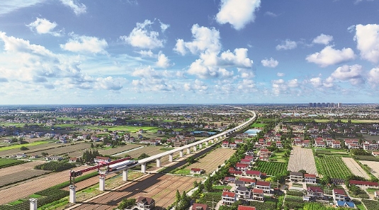7月22日,江苏省启东市,启东特大桥架梁施工现场,随着提梁机将最后一榀40米箱梁精准提放至桥墩上,新建上海至南京至合肥高速铁路沪宁段40米箱梁全部架设完成。据中铁上海工程局有关负责人介绍, 40米箱梁具有减少桥墩数量和土地占用量、降低建设成本、提高线路稳定性等优点,在跨越河流、沟谷等复杂地形时,适应性更强。同时,减少了桥墩连接共振点,让列车运行更平稳高效。通讯员 姜玉鹏 江涛 摄