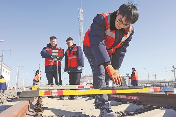 1月20日,铁路工人正利用维修天窗时间对铁轨进行检修。受降雪影响,北京迎来“冰冻模式”。为保证旅客的顺利出行,北京铁路局北京高铁工务段加强对线路的巡护检修工作,依托“人防、物防、技防”三位一体保障体系,构建高效应急响应机制,应对极端天气与突发情况,确保列车安全运行。本报记者 王伟伟 摄