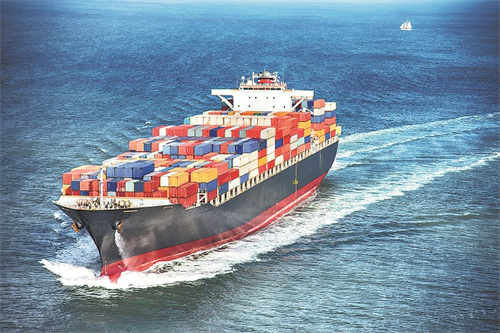 2月3日,山东青岛港,一艘装满集装箱的货轮驶出港口。视觉中国供图