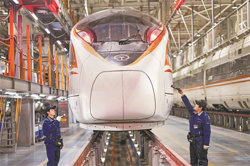 1月1日凌晨,地勤机械师在南京动车段南京南动车运用所检修库里检修动车。本报通讯员 方东旭 摄