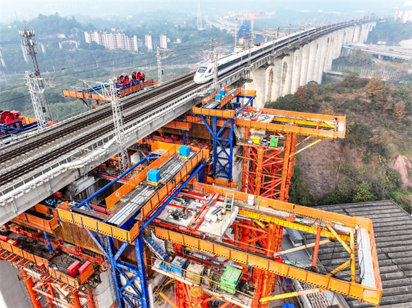 12月27日,在新建成渝中线下穿沪蓉线“托梁换柱”施工作业现场,一列高铁列车从沪蓉线新井口嘉陵江特大桥上驶过。新华社记者 唐奕 摄