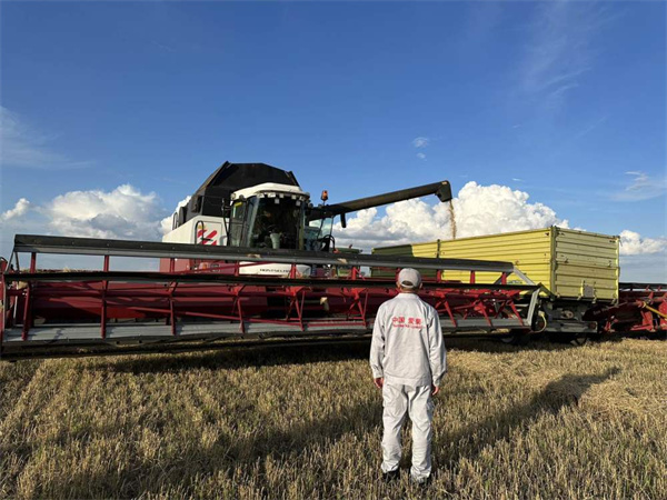 哈萨克斯坦爱菊合作基地正在进行机械化收粮作业。新华社发