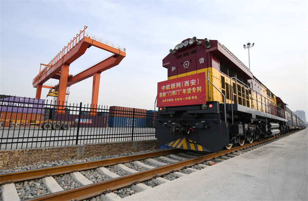 2025年1月10日,首趟中欧班列(西安)“门到门”年货专列开抵西安浐灞国际港爱菊农产品物流加工园区。新华社记者 李一博 摄