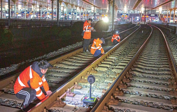 2月15日凌晨,中国铁路上海局集团有限公司南京桥工段的铁路检修人员在南京南站对线路进行检测。新华社发(景宗兴摄)
