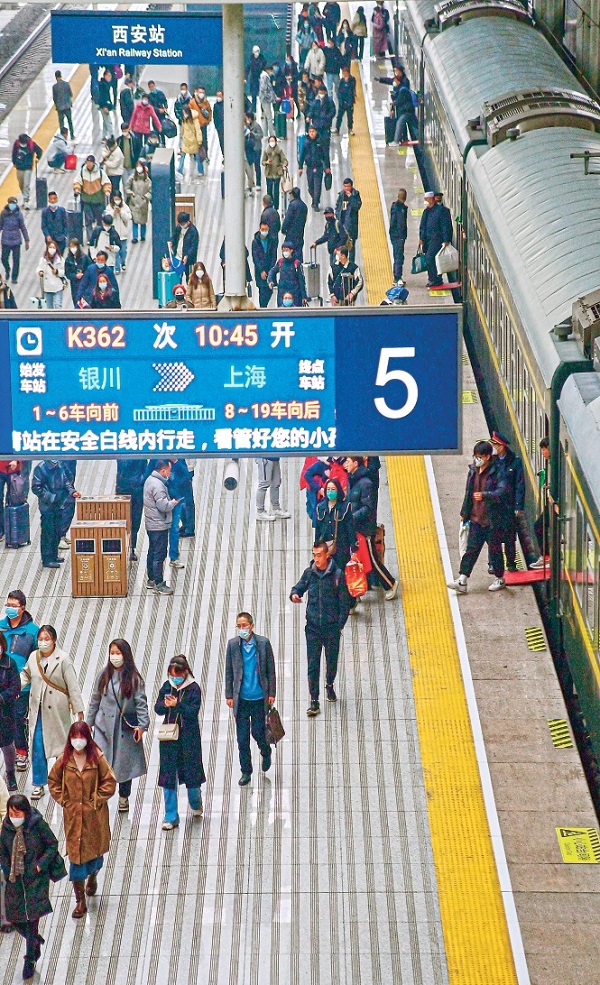 2月15日,乘坐K362次列车的旅客抵达西安站。新华社记者 李一博摄