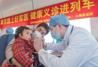 2月15日,呼吸科医生在D956次列车上为小朋友进行检查。当日,铁路上海客运段和海军军医大学第二附属医院联合在D956 次列车上开展健康义诊。新华社记者 王翔摄