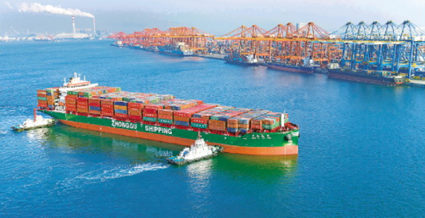 海事船在协助一艘满载集装箱的海轮停靠钦州港码头(2月11日摄)。据中国铁路南宁局集团有限公司介绍,今年春运期间,西部陆海新通道铁海联运班列发送货物7.4万标箱,其中钦州港发送2万标箱,同比增长44.3%,实现铁海联运班列“开门红”。新华社记者 张爱林摄