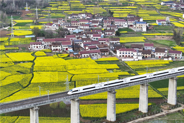 眼下,陕西汉中市百万亩油菜花竞相绽放,西成高铁线上,一趟趟列车穿行在金黄色的油菜花海之中,为秦巴山区勾画出朝气蓬勃的春日景象(3月20日摄)。新华社记者邵瑞摄