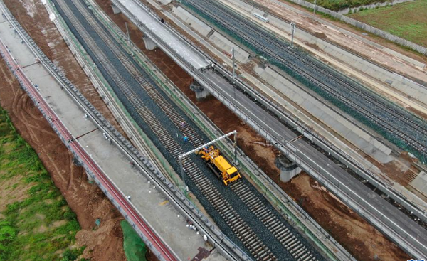 10月11日,在西康高铁西安东站至牛背梁站区间,正在铺设首对无缝钢轨,标志着西康高铁全线铺轨正式启动。新华社记者 李一博 摄